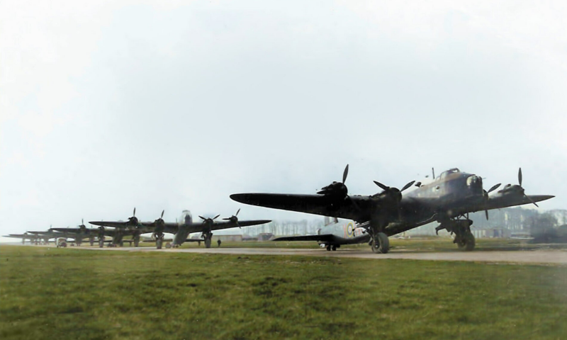 A well-known photo of 218 (Gold Coast) Squadron Stirling Bomber DJ976 HA-'A. Apple, which has been skillfully colourised.