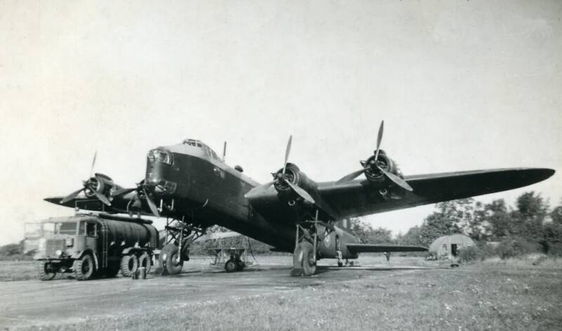 A trio of Stirling's roar over RAF Downham Market at low level. The aircraft on the left is N3721 HA-P PETER, flown by Sergeant Ted Gough and crew. This aircraft went on to complete 62 operations, all with 218 (Gold Coast) Squadron. This aircraft went on to do 62 operations, all with 218 (Gold Coast) Squadron—photo taken by Photographic Section Sergeant Jack Walmsley, RAF Downham Market.
